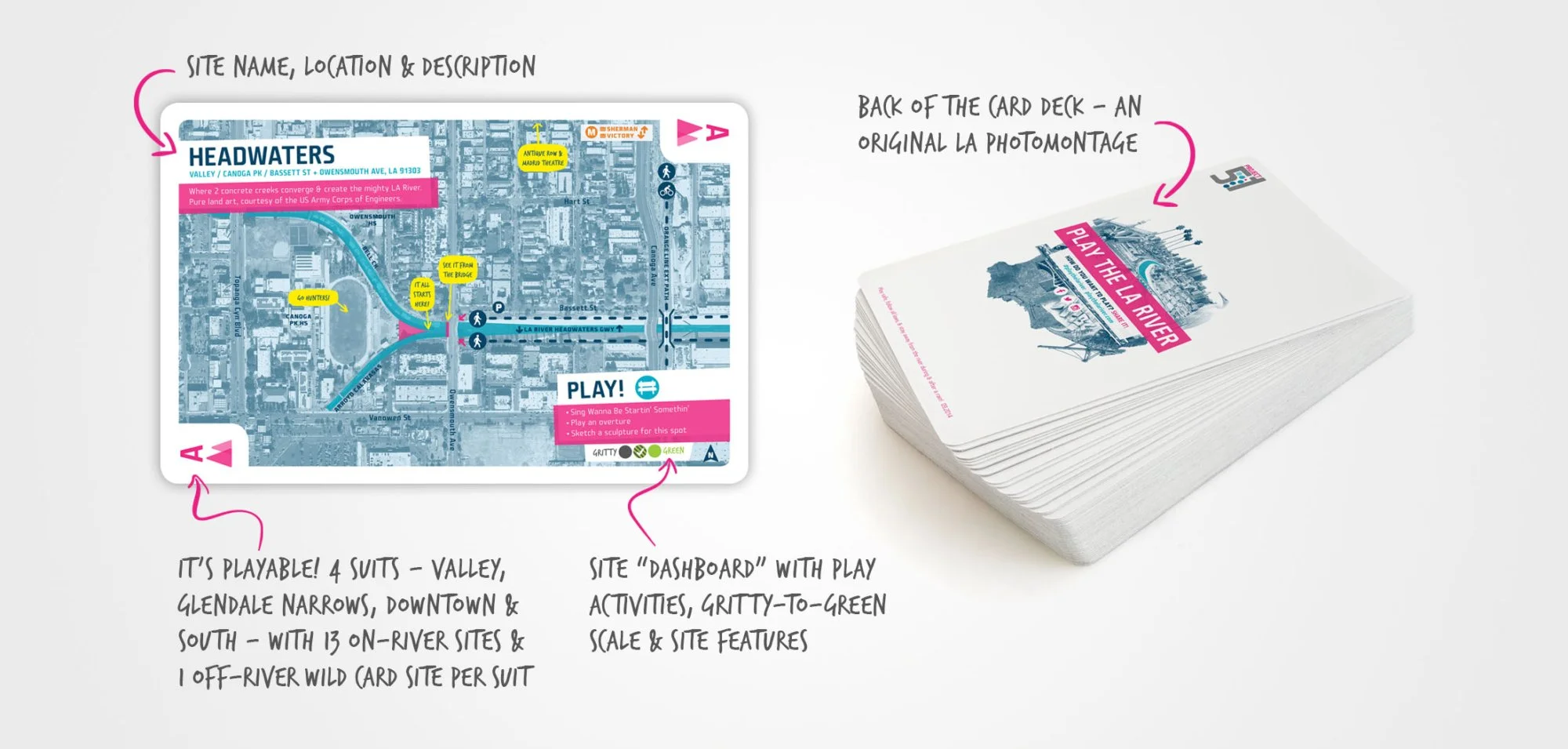 The Play the LA River card deck was designed to be a collectible, playable guide to the entire 51-mile LA River organized in 4 geographical suits—Valley, Glendale Narrows, Downtown & South. The cards offer 56 sites to discover—52 places on the river + 4 wild-card sites that are close by and river-related. Each card includes a map, some key information about the site, and a few starter ideas for how to play...